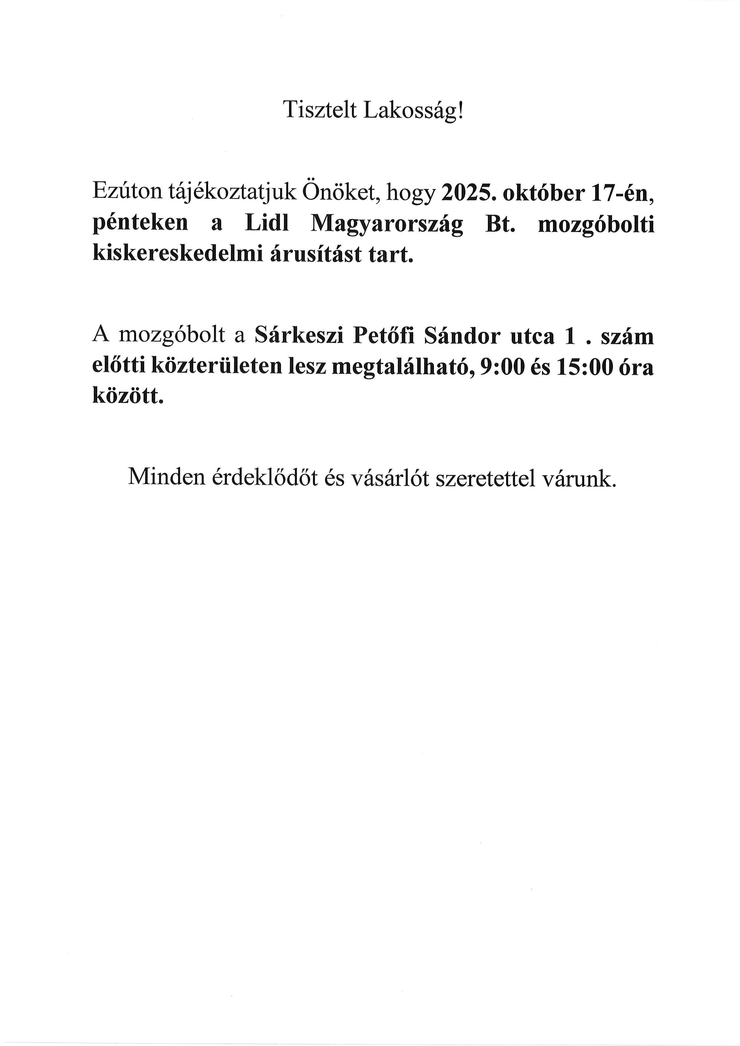 Lidl Magyarország Bt. mozgóbolti kiskereskedelmi árusítást tart.